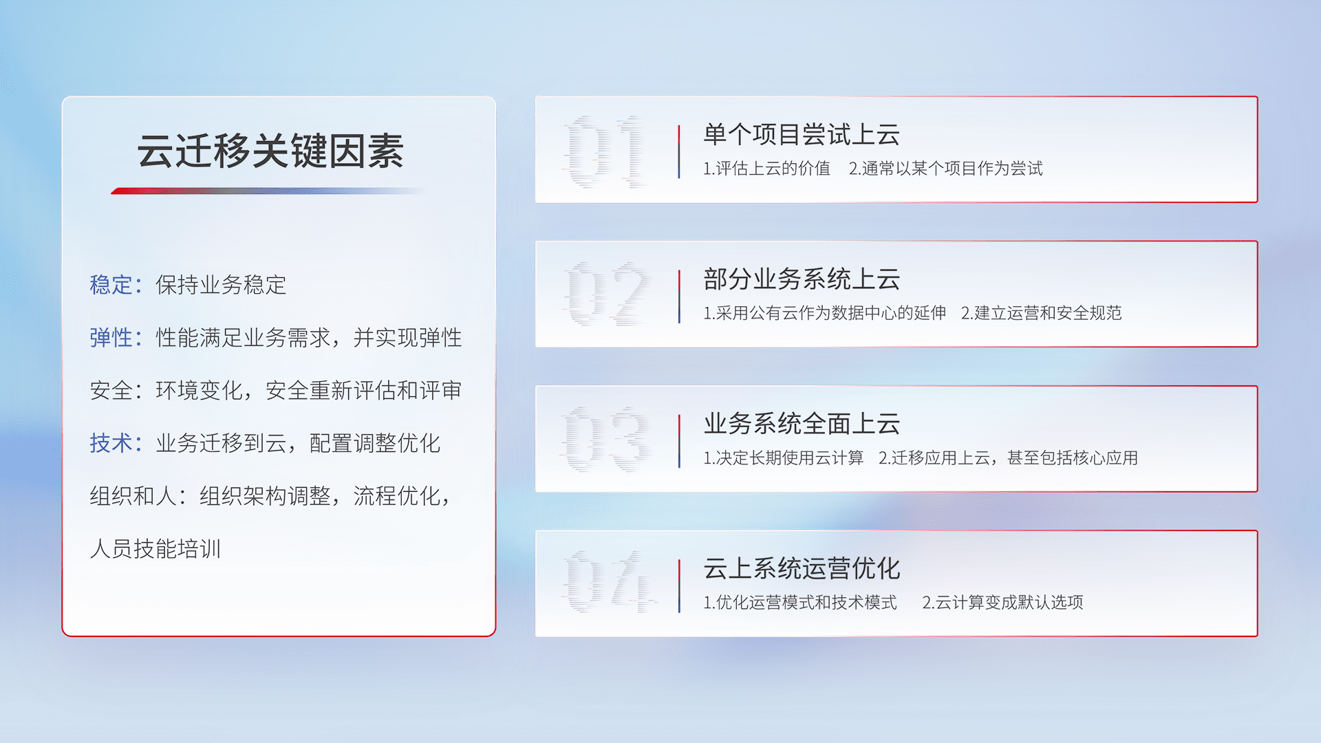 结合实际业务,,从规划设计、、、、云平台选型、、云原生改造、、、数据迁移、、集成交付,,迁移全过程为客户识别最佳上云路径,,做好风险识别管理,,设计网络架构、、身份权限、、、安全审计合规、、操作审计、、、日志审计、、、监控告警策略、、、、多站点容灾设计等,,,,对云上基础设施进行整体规划,,,,提升IT治理水平,,,,以满足弹性、、、高可用、、高性能的需求。。。