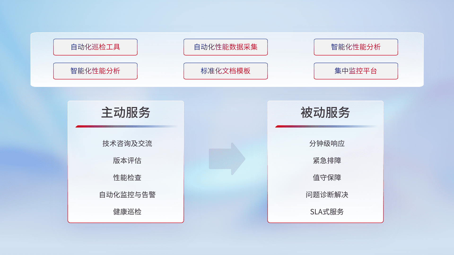 智能化工具和标准化文档,,,,保障服务质量,,提供主动服务(包含技术咨询、、、版本评估、、性能检查、、、自动化监控与告警、、、、健康巡检)和被动服务包含(分钟级响应、、、紧急排障、、、值守保障、、、问题诊断解决、、、SLA服务)。。。。